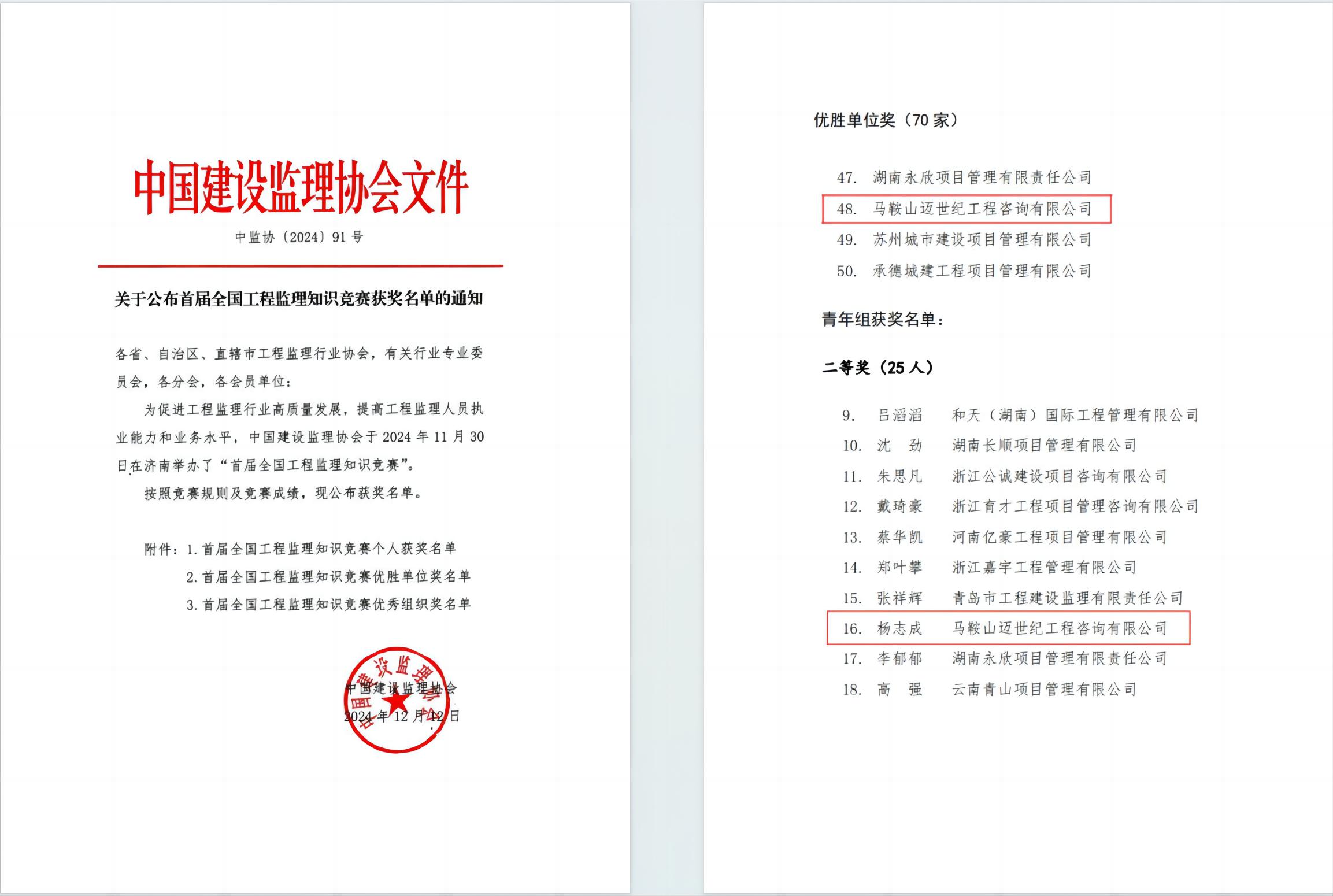 12月13日,中國建設監理協(xié)會(huì )發(fā)布了《關(guān)于公布首屆全國工程監理知識競賽獲獎名單的通知》,中冶華天國際咨詢(xún)分公司楊志成取得佳績(jì),獲青年組二等獎,分公司獲“優(yōu)勝單位獎”。以上榮譽(yù)的獲得,集中展現了中冶華天出色的綜合實(shí)力和華天監理人員扎實(shí)的專(zhuān)業(yè)素養,也是響應“大干60天、沖刺全年旺”活動(dòng)的最新成果。