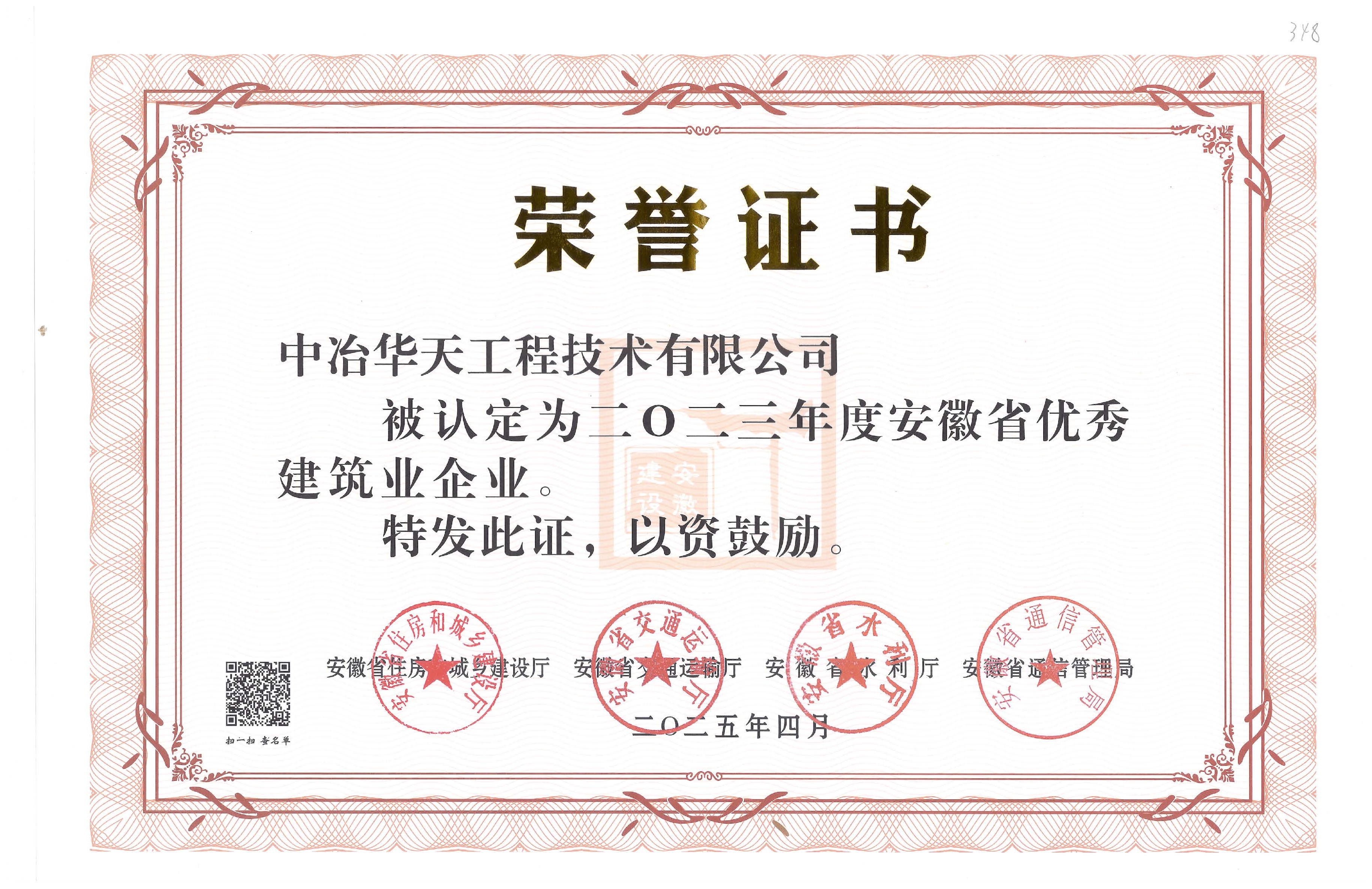 近日,在安徽省住房和城鄉(xiāng)建設廳、交通運輸廳、水利廳、通信管理局聯(lián)合開展的“安徽省優(yōu)秀建筑業(yè)企業(yè)”評選活動中,中冶華天被認定為2023年度“安徽省優(yōu)秀建筑業(yè)企業(yè)”。這是中冶華天再獲此項榮譽,既是對公司綜合實力和專業(yè)能力的高度認可,也是對公司近年在經營發(fā)展、管理創(chuàng)新、履行責任和企業(yè)文化建設等方面成果的充分肯定。