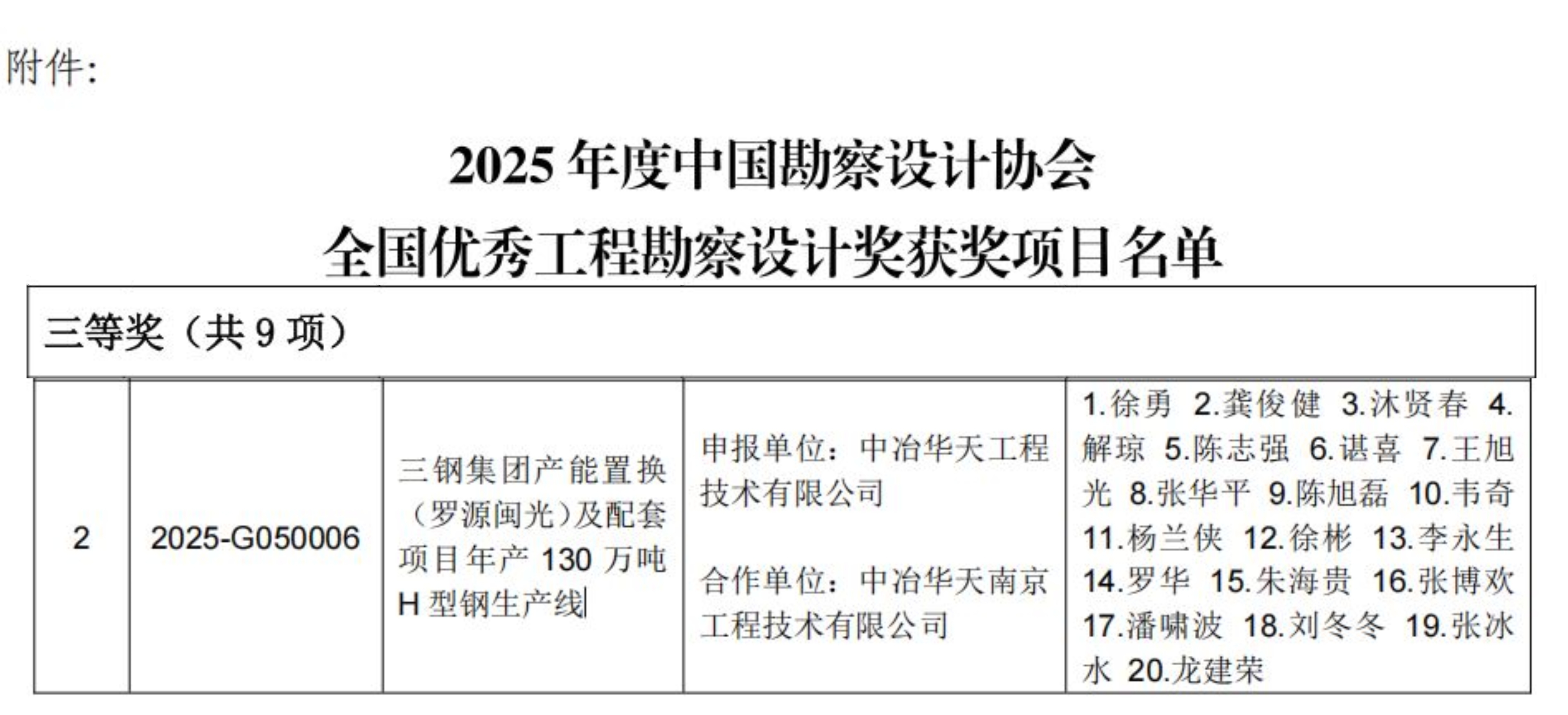 近日,2025年度中國勘察設(shè)計(jì)協(xié)會(huì)全國優(yōu)秀工程勘察設(shè)計(jì)獎(jiǎng)評(píng)選結(jié)果正式公布,中冶華天參賽項(xiàng)目《三鋼集團(tuán)產(chǎn)能置換(羅源閩光)及配套項(xiàng)目年產(chǎn)130萬噸H型鋼生產(chǎn)線》榮獲冶金工業(yè)工程設(shè)計(jì)三等獎(jiǎng)。這是該項(xiàng)目繼全國冶金行業(yè)工程設(shè)計(jì)優(yōu)秀成果一等獎(jiǎng)后再度斬獲國家級(jí)獎(jiǎng)項(xiàng),集中彰顯了中冶華天在工程勘察設(shè)計(jì)領(lǐng)域的創(chuàng)新技術(shù)優(yōu)勢(shì)與深厚設(shè)計(jì)能力,也體現(xiàn)了行業(yè)協(xié)會(huì)高度肯定公司在高水平行業(yè)競(jìng)爭(zhēng)中的卓越實(shí)力與領(lǐng)先地位。