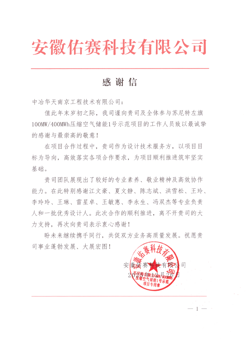 近日,中冶華天收到來自蘇尼特左旗100MW/400MWh壓縮空氣儲(chǔ)能1#示范項(xiàng)目合作方安徽佑賽科技有限公司(簡(jiǎn)稱“佑賽科技”)的感謝信,信中對(duì)中冶華天在項(xiàng)目合作過程中展現(xiàn)出的專業(yè)能力和敬業(yè)精神給予高度評(píng)價(jià),對(duì)設(shè)計(jì)團(tuán)隊(duì)成員表示衷心感謝,集中展現(xiàn)了公司踐行的高品質(zhì)履約精神與華天人的向陽風(fēng)貌。